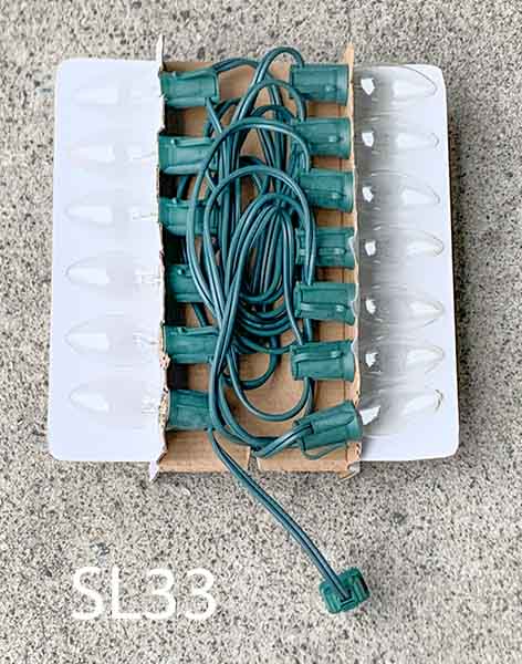 SL33-Qty-3. Green 25′ string lights with C9 socket every 12″. One string has clear bulbs as in pic.